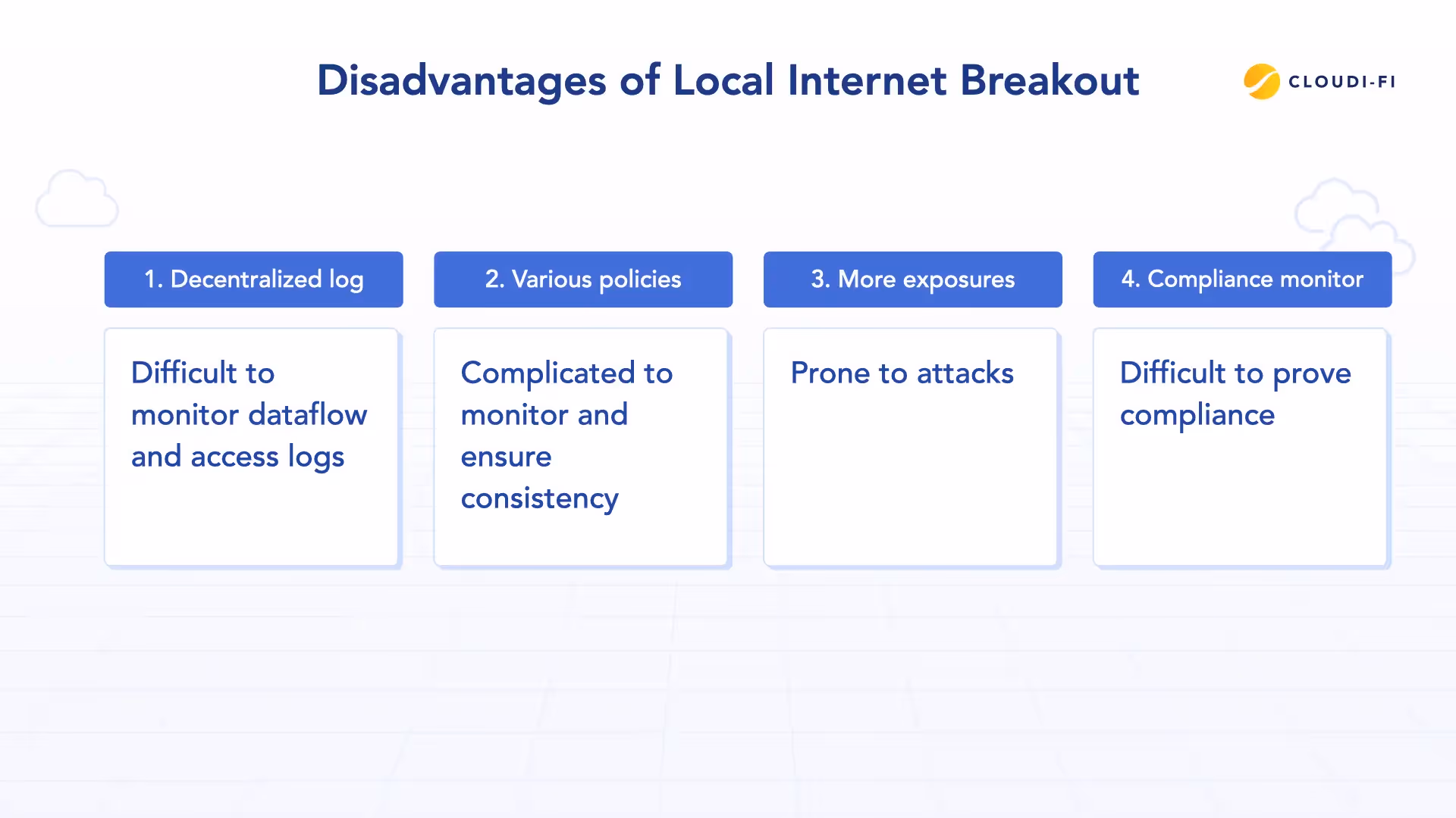 Managing multiple processes and policies across Local Internet Breakout locations requires extensive documentation and administration, which can become a challenge. It could be an issue if organizations cannot prove their compliance across their whole Local Internet Breakout locations because of administrative burdens.