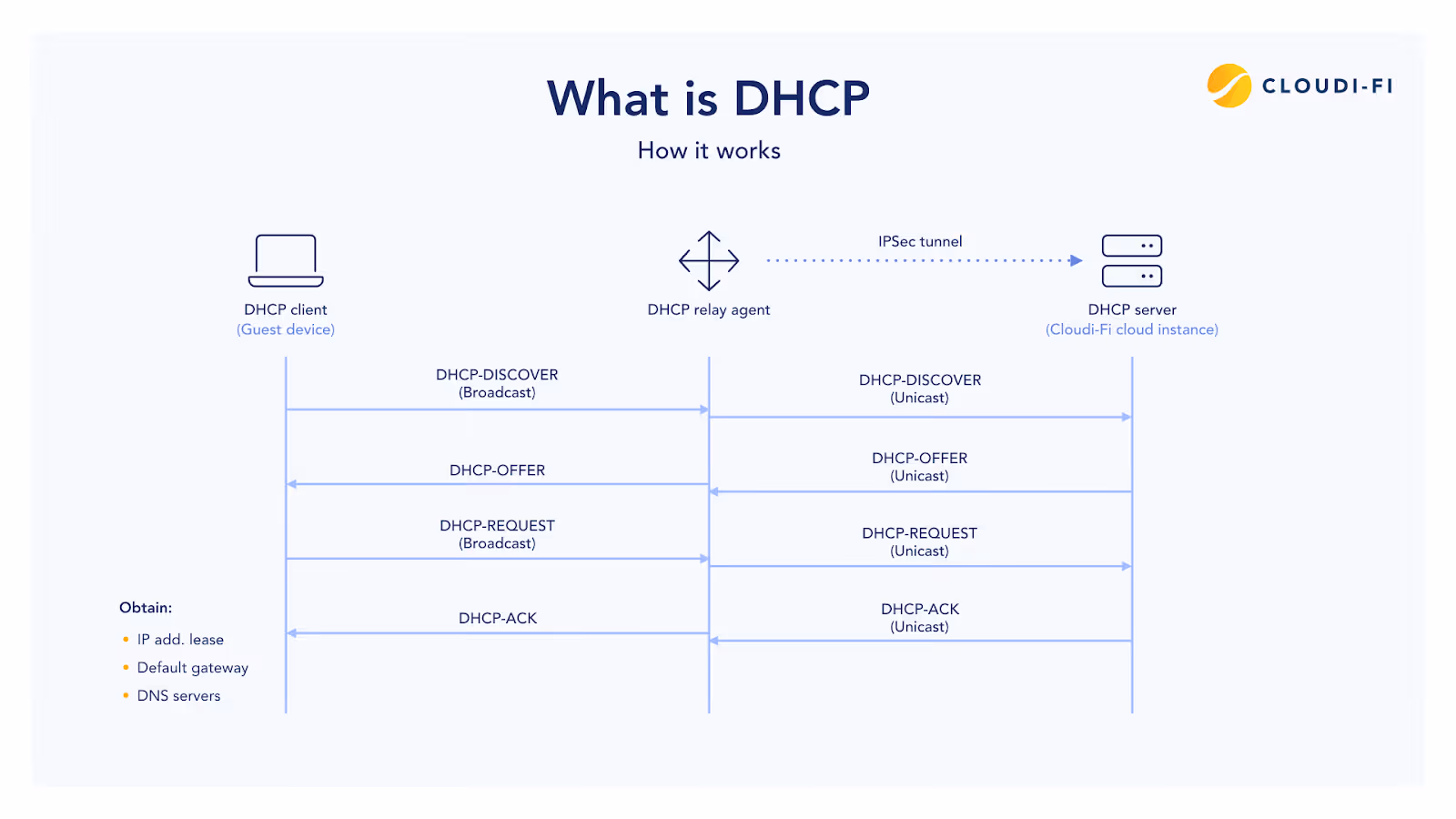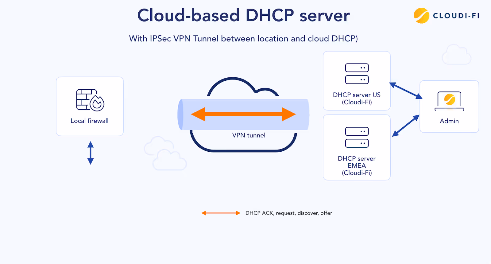 - Local router or Firewall connected to the DHCP Client should act as a DHCP Relay Agent so that it can forward DHCP requests from the client to the Cloudi-Fi’s DHCP server across an IPsec tunnel.