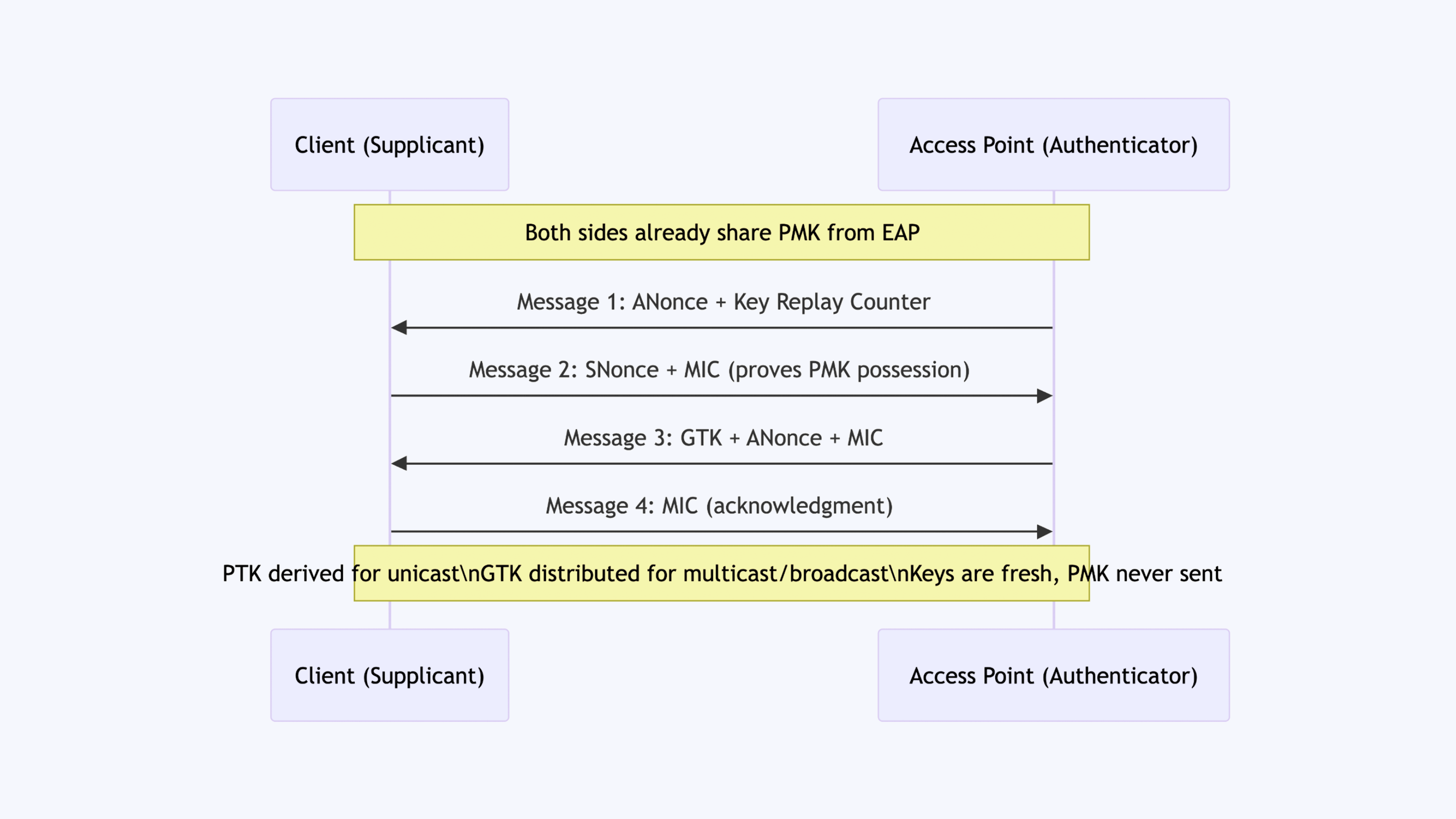 - PMK Derivation: The Pairwise Master Key (PMK) is derived from the successful EAP exchange. This is the cryptographic secret that distinguishes Enterprise security from PSK.
