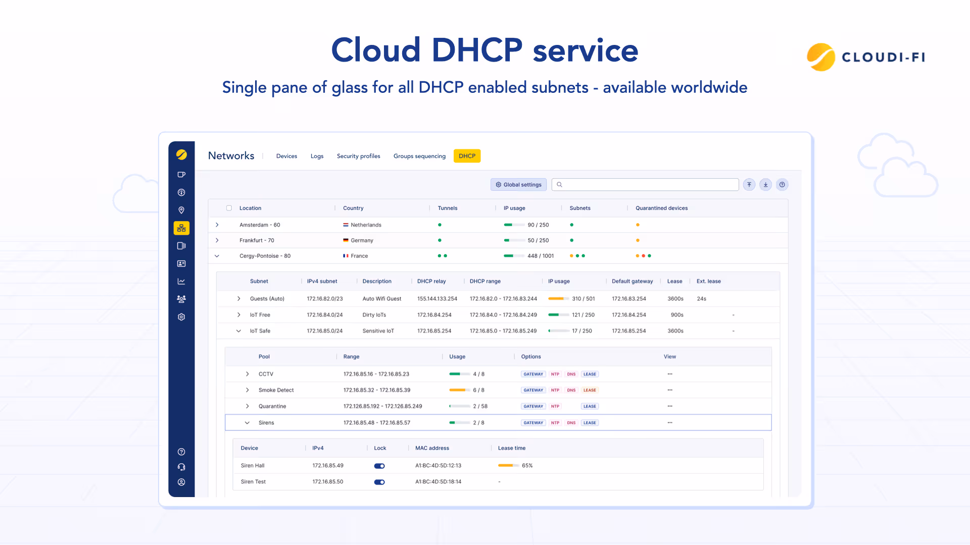 Whether you’re managing hundreds of branch locations or a hybrid workforce, Cloudi-Fi DHCP simplifies network provisioning with centralized configuration and monitoring, reducing IT overhead and operational complexity.