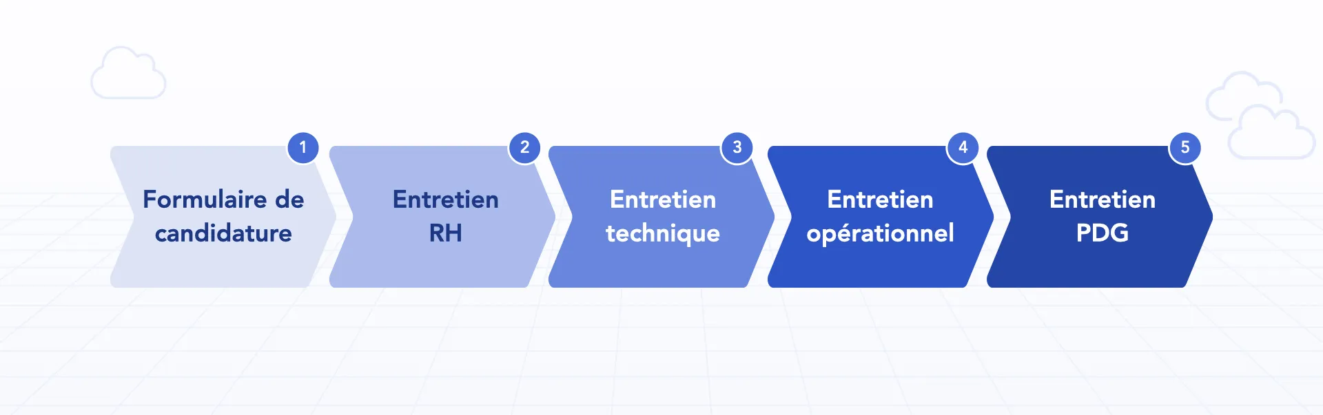 Dans la plupart des cas, nous appliquons un processus de recrutement en cinq étapes afin d'identifier les meilleurs talents. Soignement conçu pour permettre une évaluation approfondie, ce processus peut s'étendre sur une période allant jusqu'à quatre semaines.