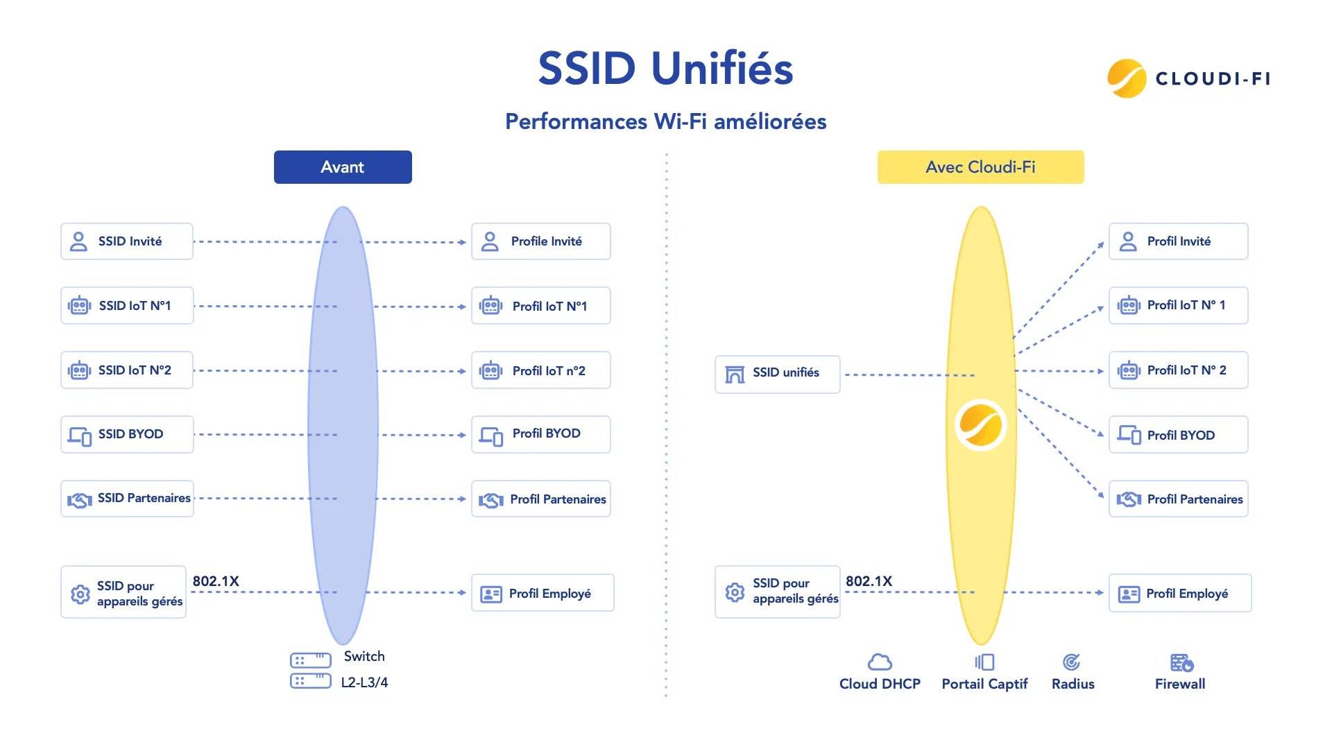 Le protocole 802.1X offre un contrôle d’accès au réseau basé sur l’identité. Avec Cloudi-Fi, vous bénéficiez d’une solution cloud-native qui s’intègre facilement à votre infrastructure existante - aucun serveur RADIUS local ni configuration complexe n’est nécessaire.