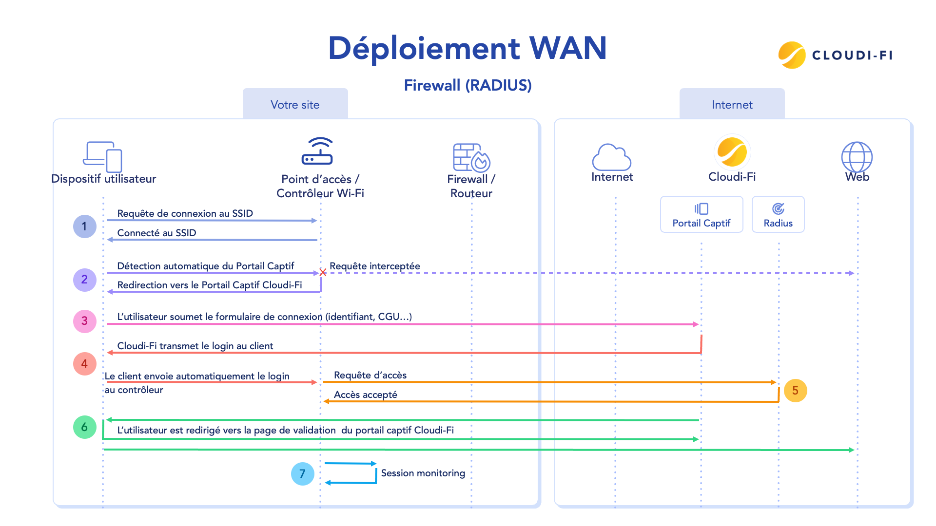 Chaque utilisateur doit s’authentifier avant d’accéder au réseau. Les journaux détaillés sont stockés de manière sécurisée dans le cloud.