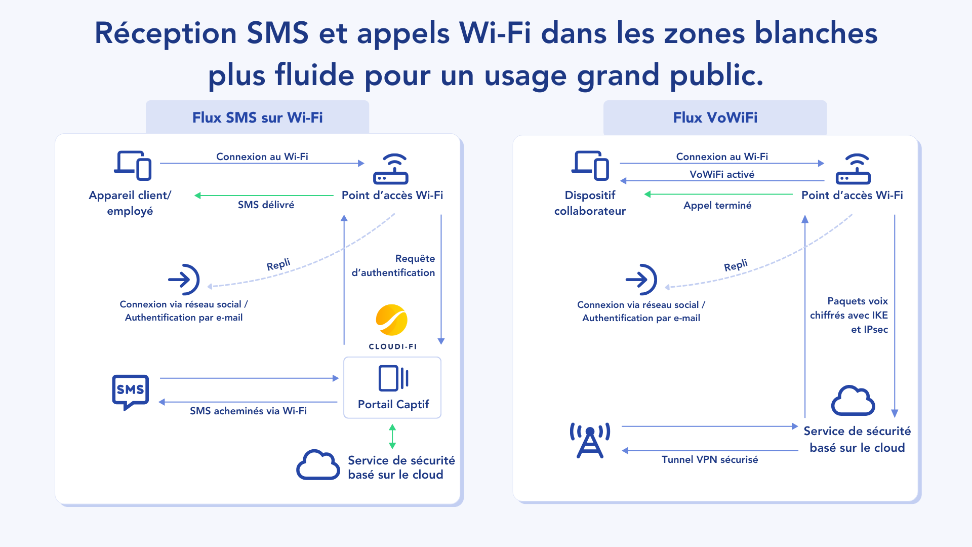 Pour les dispositifs ne supportant pas le VoWiFi, comme les anciens téléphones, la plateforme cloud de Portail Captif et d’Identity Cloudi-Fi offre des méthodes alternatives d’authentification telles que les connexions via réseaux sociaux ou email. Cela apporte de la flexibilité pour les utilisateurs qui ne peuvent pas utiliser le SMS via Wi-Fi ou le VoWiFi, garantissant que tous les utilisateurs, y compris ceux disposant d’anciens dispositifs ou les visiteurs internationaux sans accès réseau local, peuvent tout de même se connecter au Wi-Fi Guest des bureaux dans les zones blanches.