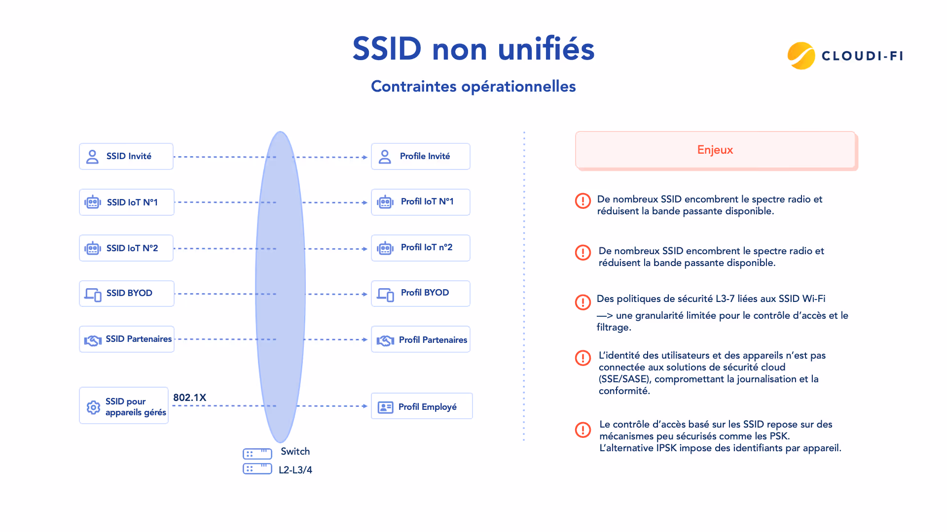 Autrefois, la segmentation Wi-Fi par SSID semblait être la solution évidente. Cependant, cette approche provoquait des problèmes de performance et est désormais remplacée par des capacités de sécurité intégrées à des niveaux supérieurs de la cybersécurité. Offrez-vous cette visibilité et ce contrôle dans votre réseau avec Cloudi-Fi.